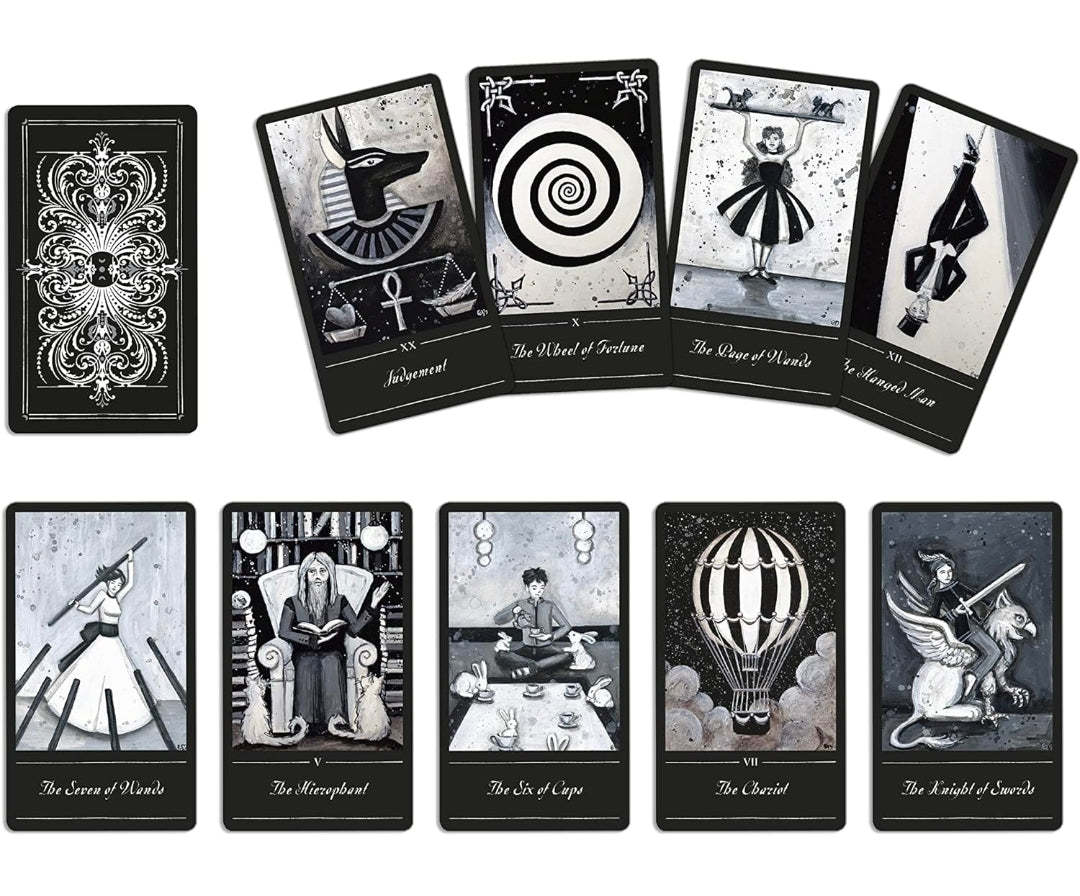 Welcome to The Phantomwise Tarot. This black-and-white world is a little bit circusy, a little bit Wonderland, and a little bit nocturnal phantasia of its own invention. It is a mix of myth and fairy tale, where each individual you meet may be an illusion, reflection, or distortion.